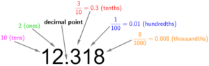 In the value shown above, the digit immediately after the decimal point represents “tenths”, and there are 3 of them, so it is worth 3/103/10 or 0.30.3. The next digit along is worth less – it represents “hundreds”, and there is 1, so it is worth 1/1001/100 or 0.010.01. You can find more info on place value here.